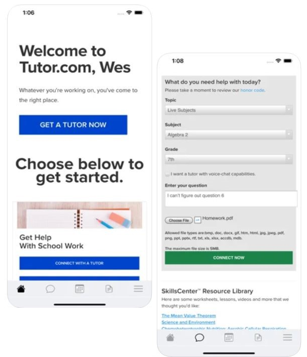 • Connect with a live tutor for 1-to-1 help in academic classes, study skills, and test prep